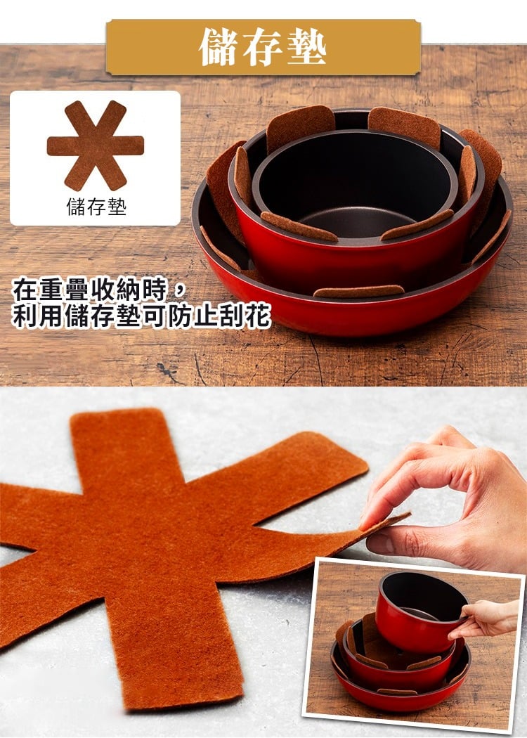 Two easy-click handles fit all pots and pans, saving space and adding convenience.