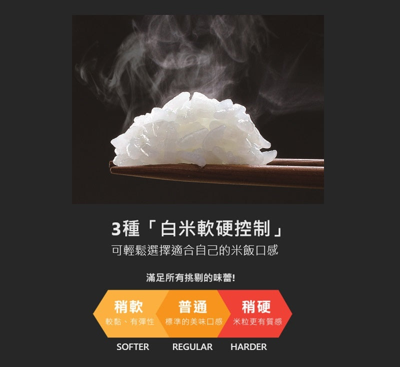 Choose your preferred texture with 3 white rice settings: Regular, Softer, and Harder.