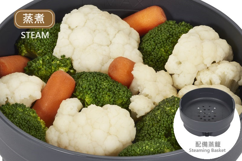 Steaming basket included — great for vegetables, fish, and more.