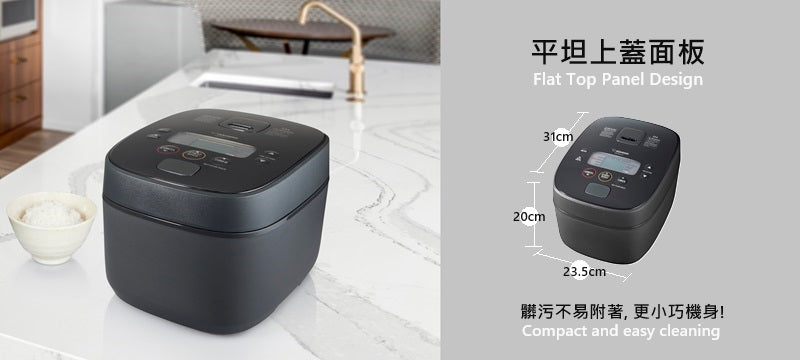 Flat top panel design and self-standing rice spatula for cleaner countertops.