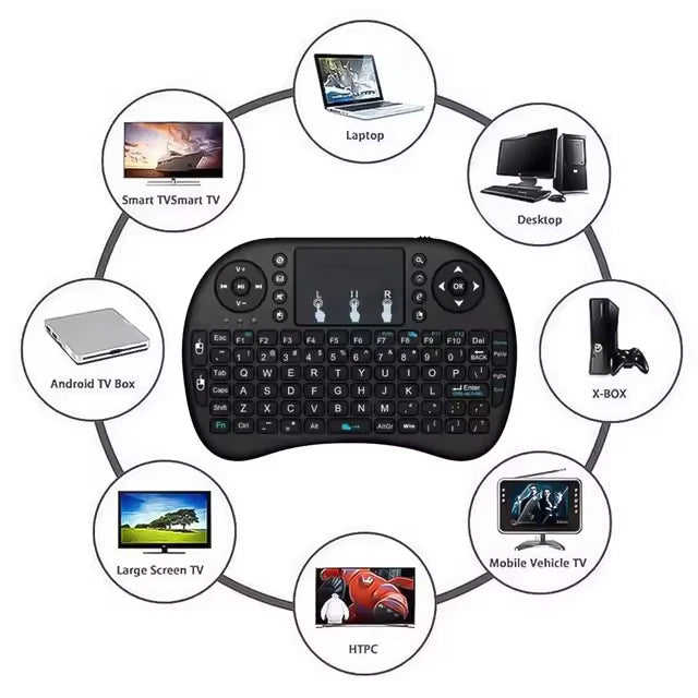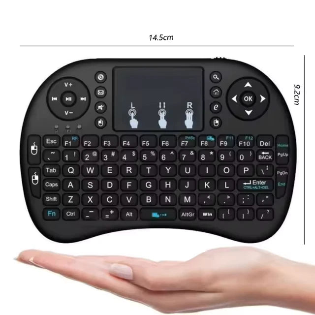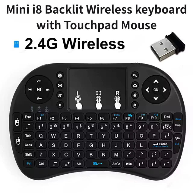 The Mini i8 2.4GHz Backlit Wireless Keyboard is a compact all-in-one solution designed for effortless control of your smart devices. Featuring a responsive touchpad mouse and backlit keys, it’s perfect for use in any lighting environment. With its ergonomic design, wireless 2.4GHz connectivity, and plug-and-play USB receiver, you can easily navigate, type, and control your TV box, PC, laptop, projector, or gaming console from the comfort of your sofa. Lightweight and portable, the Mini i8 makes entertainment and work more convenient than ever.