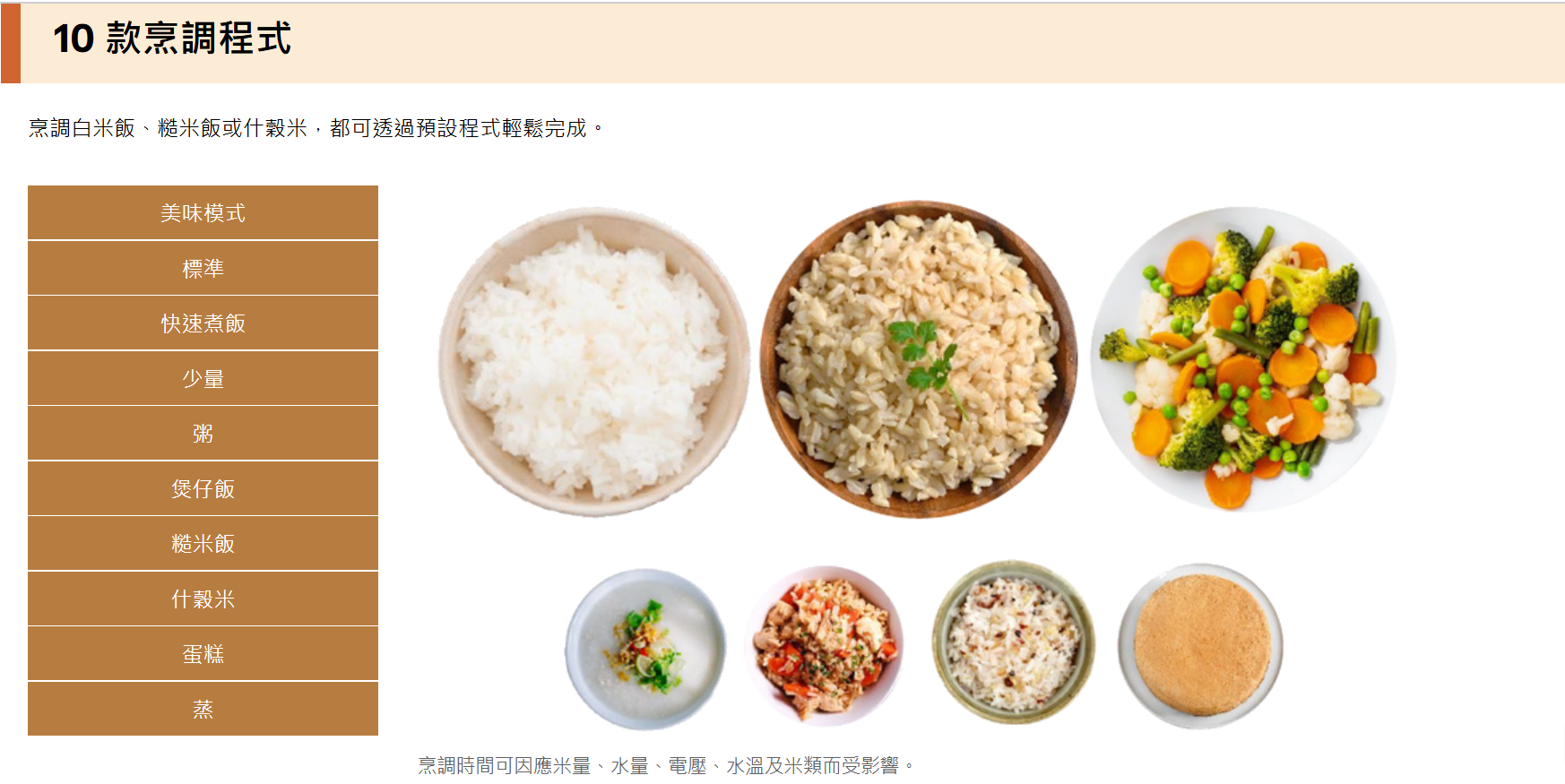Includes Jasmine/Pearl Rice (Tasty, Standard, Quick, Small Portion), Congee, Brown Rice, Mixed Grains, Claypot Rice, Steamed Dishes, and Cake.