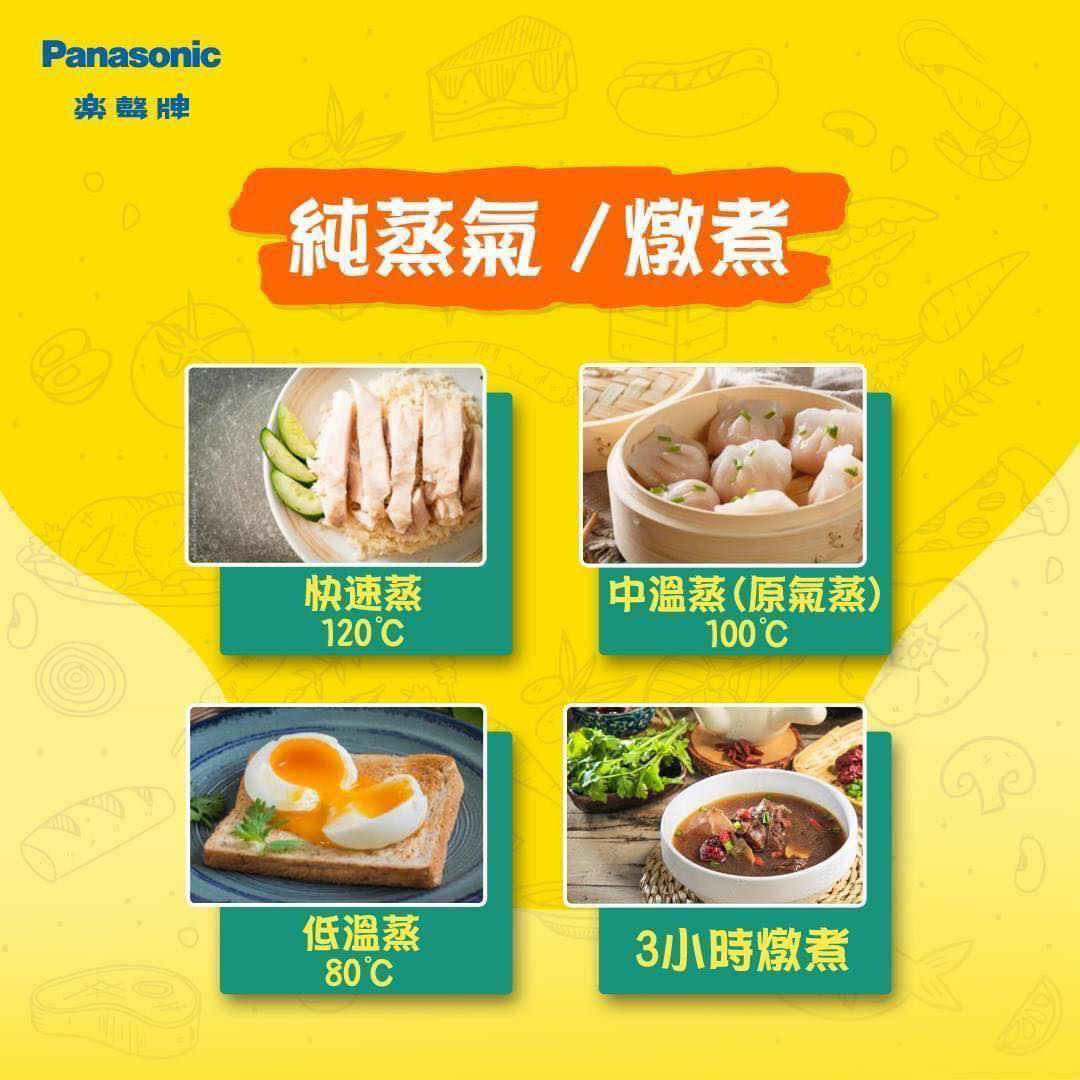 Includes low-temp steam, mid-temp (original) steam, high-temp rapid steam, healthy fry, stew, bake, and steam convection.