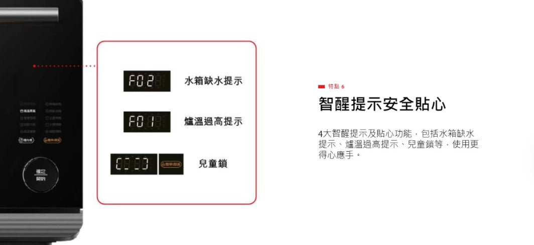 Safety Features: Overheat alert (F01), Water shortage alert (F02), Child lock