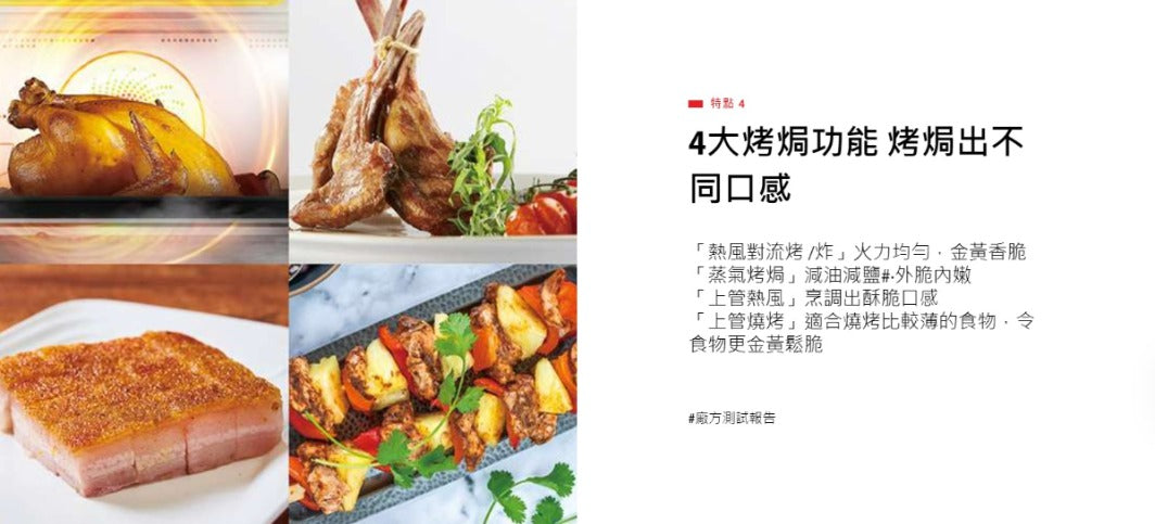 Cooking Modes: Pure steam (3 types), convection, steam-bake, upper heat/fan, grilling
